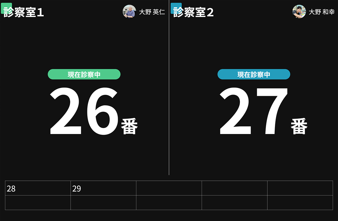 現在の待ち人数はウェブサイト上、院内の待合室に設置したディスプレイ両方に表示しており、患者さんの待ち時間ストレスを少しでも緩和するようにしています。